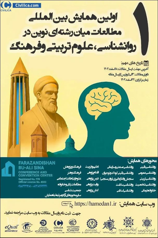اولین همایش بین المللی مطالعات میان رشته ای نوین در روانشناسی، علوم تربیتی و فرهنگ در تاریخ ۲۲ اسفند ۱۴۰۴ توسط ،مرکز همایش و کنفرانس بوعلی سینا در شهر همدان برگزار خواهد شد.با توجه به اینکه این همایش به صورت رسمی برگزار می گردد، کلیه مقالات این کنفرانس در پایگاه سیویلیکا و نیز کنسرسیوم محتوای ملی نمایه خواهد شد و شما می توانید با اطمینان کامل، مقالات خود را در این همایش ارائه نموده و از امتیازات علمی ارائه مقاله کنفرانس با دریافت گواهی کنفرانس استفاده نمایید.