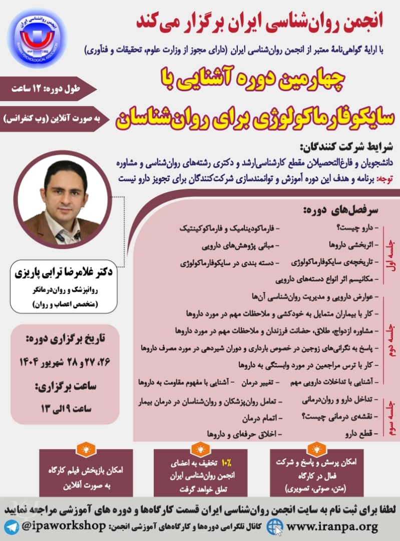چهارمین دوره آشنایی با سایکوفارماکولوژی برای روان‌شناسان