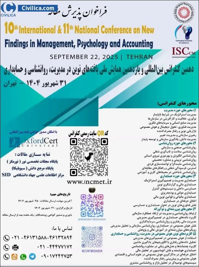 دهمین کنفرانس بین المللی و یازدهمین کنفرانس ملی یافته های نوین در مدیریت، روانشناسی و حسابداری در تاریخ ۳۱ شهریور ۱۴۰۴ توسط ،موسسه پژوهشی مدیریت مدبر و با مشارکت دانشگاه جامع علمی کاربردی و سایر مجامع علمی در شهر تهران برگزار خواهد شد.با توجه به اینکه این همایش به صورت رسمی برگزار می گردد، کلیه مقالات این کنفرانس در پایگاه سیویلیکا و نیز کنسرسیوم محتوای ملی نمایه خواهد شد و شما می توانید با اطمینان کامل، مقالات خود را در این همایش ارائه نموده و از امتیازات علمی ارائه مقاله کنفرانس با دریافت گواهی کنفرانس استفاده نمایید.