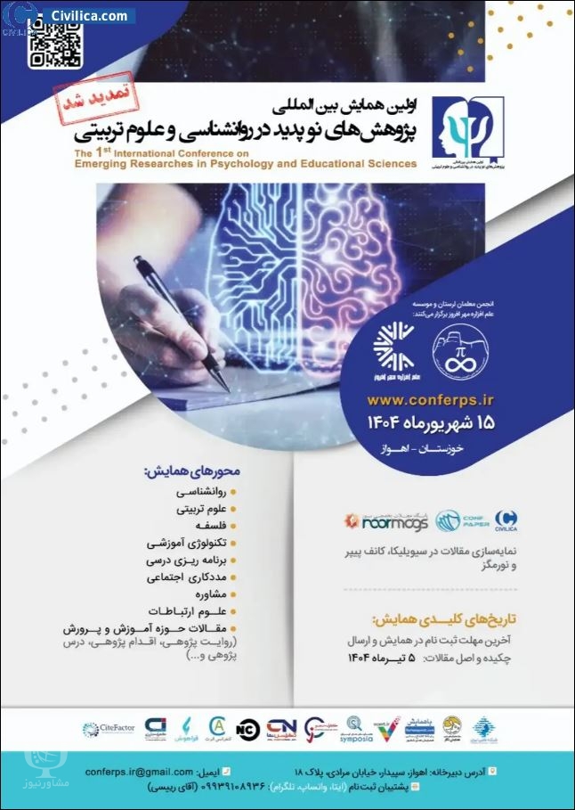 اولین همایش بین المللی پژوهش های نو پدید در روانشناسی و علوم تربیتی در تاریخ ۱۵ شهریور ۱۴۰۴ توسط ،انجمن معلمان لرستان-موسسه علم افزاره مهرافروز در شهر اهواز برگزار خواهد شد.با توجه به اینکه این همایش به صورت رسمی برگزار می گردد، کلیه مقالات این کنفرانس در پایگاه سیویلیکا و نیز کنسرسیوم محتوای ملی نمایه خواهد شد و شما می توانید با اطمینان کامل، مقالات خود را در این همایش ارائه نموده و از امتیازات علمی ارائه مقاله کنفرانس با دریافت گواهی کنفرانس استفاده نمایید.